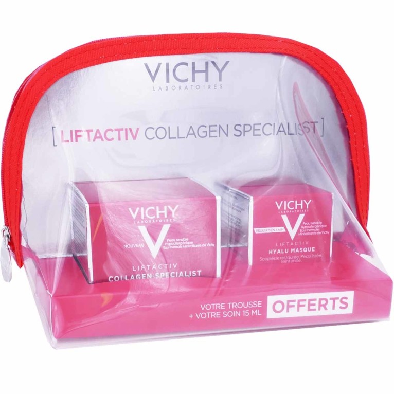 La Trousse LIFTACTIV COLLAGEN SPECIALIST de VICHY discount, une trousse qui regroupe 2 soins pour un programme anti-rides et éclat dans votre parapharmacie en ligne à prix discount, pour un visage qui retrouve sa jeunesse et sa beauté ! Liftactiv Collagen Specialist (50ml) ; Hyalu-Masque (15ml) offert. Destiné à toutes les peaux