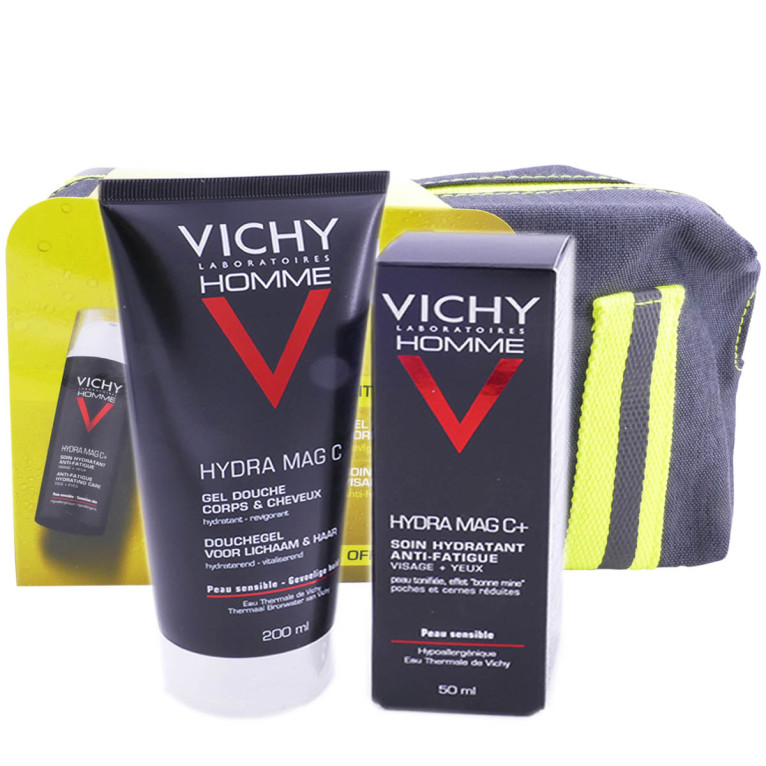 La trousse « Hydra Mac C » de VICHY, une jolie trousse destinée à prendre soin du visage et du corps des hommes aux peaux sensibles dès le début de la journée ! Gel douche corps et cheveux Hydra Mac C (200ml) et Soin Hydratant Anti-fatigue (50ml). Une belle trousse à offrir ou à se faire offrir !