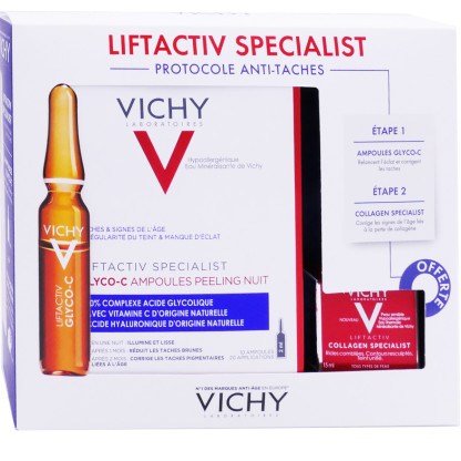 Ampoules Glyco-C + Liftactiv Collagen Specialiste 15ml Offerte VICHY a conçu une gamme de soins pour le visage destinés à lutter efficacement contre les effets de vieillissement, rides profondes et perte de fermeté, tout en offrant un teint unifié et un effet lifting durable : LIFTACTIV SPECIALIST Ampoules Peeling Nuit LIFTACTIV SPECIALIST Glyco-C : un sérum peeling de nuit sous forme d’ampoules, conçu pour estomper l’hyperpigmentation et redonner de l’éclat au visage nuit après nuit. Ce soin est composé d’un complexe d’acide glycolique (10%), d’acide hyaluronique d’origine naturelle (haut et bas poids moléculaire) et de vitamine Cg d’origine naturelle, associé à l’Eau thermale Minéralisante de Vichy pour estomper les taches pigmentaires et liées à l’âge, marques d’acné) tel un peeling, repulper l’épiderme et hydrater intensément et en profondeur pour préserver l’eau dans les cellules cutanées, tout en redonnant de l’éclat au teint. Résultat : la peau est en une nuit lissée, et lumineuse, les taches diminuent visiblement et le visage gagne en éclat jour après jour !
