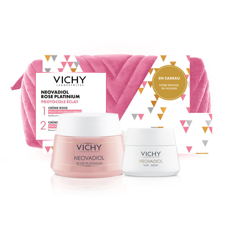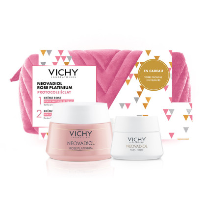 La trousse NEOVADIOL ROSE PLATINIUM pas cher des Laboratoires VICHY, 2 produits destinés aux femmes à partir de 45 ans dans un protocole éclat pour la période de pré-ménopause: 1 crème de jour Foritifiante et Revitalisante (50ml) et une crème de nuit redensifiante revitalisante (15ml) offert.