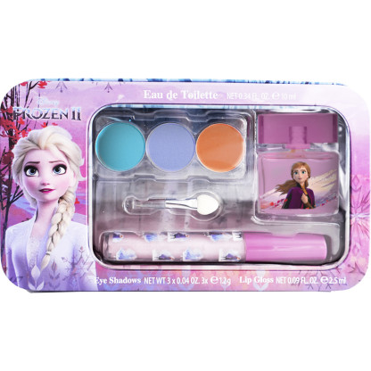 Le Coffret beauté LA REINE DES NEIGES II contient un brillant à lèvres, un trio d’ombre à paupière avec son applicateur et une eau de toilette. L’eau de toilette délivre en note de tête des senteurs de pamplemousse, en note de cœur de la framboise et fleur d’oranger et en note de fond des senteurs de vanille.