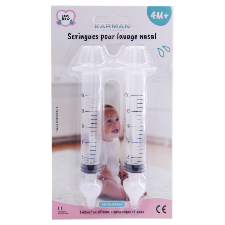Le laboratoire Karman a développé ces seringues pour le lavage nasal des enfants de plus de 4 mois. Ce système de nettoyage du nez sous forme de seringue permet une utilisation simple et rapide. Grâce à son système, la seringue va décongestionner, et rincer les muqueuses nasales de bébé en éliminant naturellement toutes les sécrétions, croûtes et agents pathogènes tout en soulageant le nez bouché. La pression de la seringue est contrôlable pour un jet doux et uniforme dans la narine. L’embout en silicone doux permettra une utilisation sûre et agréable. Facile d’utilisation, la seringue et son embout se démontent et se lavent facilement.