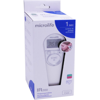 MICROLIFE, entreprise leader mondial dans le développement et la fabrication de matériel médical, conçoit des appareils pour le bien-être et le confort de chacun, particuliers ou professionnels, comme les thermomètres, tensiomètres appareils de soins respiratoires, appareils chauffants souples. Le Thermomètre IR200 est un thermomètre auriculaire nouvelle génération. Sa technologie permet d’indiquer la température en seulement un seconde par un signal sonore. Pour une température supérieure à 37,4°C une lumière rouge s’allume grâce à la technologie Silent Glow. Il mémorise les 30 dernières mesures avec la date et l’heure afin de suivre l’évolution de la température. Il bénéficie d’un système de guidage ACCUsens et d’une sonde lumineuse de couleur bleue qui aide au bon positionnement de la sonde dans l’oreille en affichant « bon » (« good ») sur l’écran et en émettant un bip sonore. Le grand écran rétro-éclairé permet une bonne visibilité des données même dans le noir. La technologie « clean me » (« nettoyez moi ») rappelle de nettoyer la sonde après utilisation pour une bonne hygiène. Testé cliniquement. Thermomètre Auriculaire IR200 peut également mesurer la température de l’air ambiant d’une pièce et d’objets. Testé cliniquement et recommandé par les médecins