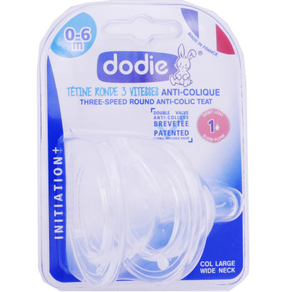 Les produits Dodie offrent aux bébés les meilleurs produits pour leur nutrition et leur confort et des produits aux mamans pour leur confort d'allaitement, de conservation et de stérilisation. Les tétines en silicone souples débit 1 ont un col large et un bout rond comme le sein de la maman pour le plus grand confort de bébé lors du repas. Elle possède une fente anti-déchirure brevetée pour une sécurité optimale et un anneau d’étanchéité qui permet de bien positionner la tétine dans la bague du biberon pour limiter tout risque de fuite. . Sa technologie bénéficie d’une double valve intégrée à la tétine qui limite les coliques, les régurgitations et l’aérophagie en faisant circuler l’air régulièrement dans le biberon. Pratique par son débit variable à 3 vitesses et la fente élargie pour l’épaisseur des laits et des soupes, il suffit de tourner le biberon pour changer le débit lors de la tétée pour s’adapter à l’appétit de bébé. Les tétines sont compatibles avec tous les biberons INITIATION+ et SENSATION+ de DODIE.