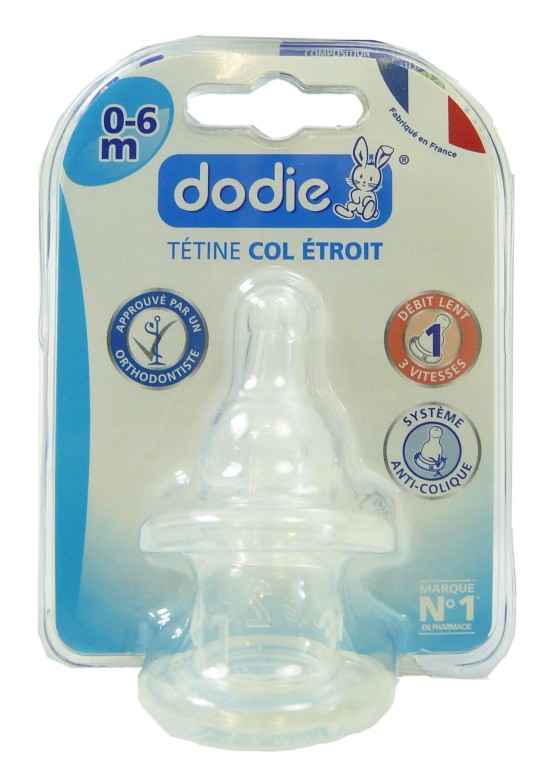 Les produits Dodie offrent aux bébés les meilleurs produits pour leur nutrition et leur confort et des produits aux mamans pour leur confort d'allaitement, de conservation et de stérilisation. Les tétines en silicone souples débit lent ont un bout court et effilé en forme de cerise pour le plus grand confort de bébé lors du repas. Elle possède une fente anti-déchirure brevetée pour une sécurité optimale et un anneau d’étanchéité qui permet de bien positionner la tétine dans la bague du biberon pour limiter tout risque de fuite. Ses 3 barrettes de régulation d’air à la base de la tétine limitent les coliques, les régurgitations et l’aérophagie. Pratique par son débit variable à 3 vitesses, il suffit de tourner le biberon pour changer le débit du lait lors de la tétée pour s’adapter à l’appétit de bébé. Les tétines sont compatibles avec les biberons en verre et microbiberon de DODIE.