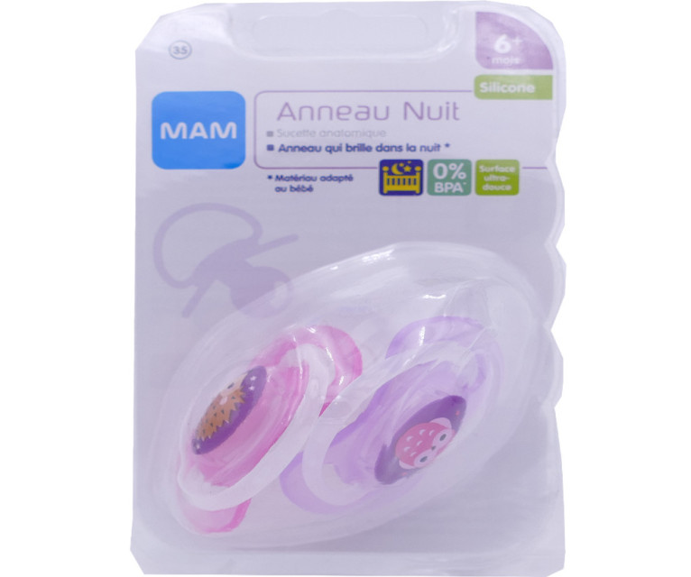 MAM développe depuis 35 ans des produits de puériculture uniques, tant par leur design que par leur fonctionnalité, afin de favoriser le développement des jeunes enfants et répondre aux exigences de leur parents. Chaque produit est conçu en partenariat avec des professionnels du monde médical, pédiatrique et scientifique : médecins, sages-femmes, psychologues du développement, designers et experts en technologie, afin que tous les bébés démarrent la vie du bon pied. Les sucettes MAM accompagnent les bébés en satisfaisant leur réflexe de succion et en leur procurant un sentiment d’apaisement. Les sucettes MAM sont conçues pour garantir un maximum de confort aux bébés pendant les différentes phases de leur développement. Leur design anatomique assure une parfaite prise en bouche et le respect du développement de la mâchoire. Les tétines en silicone souple SkinSoft sont extra-douces et offre une bonne stabilité en bouche. La sucette en silicone Nuit MAM avec anneau 6 mois et +, préserve la peau fragile des bébés et sa collerette évasée n’entrave pas la respiration. Son bouton phosphorescent permet à bébé et à ses parents de retrouver facilement la sucette perdue dans l’obscurité de la chambre. Son anneau assure une bonne prise en main et permet de rattacher la sucette à un attache-sucette.