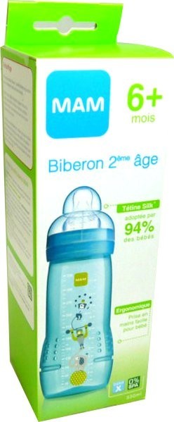 MAM développe depuis 35 ans des produits de puériculture uniques, tant par leur design que par leur fonctionnalité, afin de favoriser le développement des jeunes enfants et répondre aux exigences de leur parents. Chaque produit est conçu en partenariat avec des professionnels du monde médical, pédiatrique et scientifique : médecins, sages-femmes, psychologues du développement, designers et experts en technologie, afin que tous les bébés démarrent la vie du bon pied. Le biberon 2ème âge MAM de 330ml, en plastique incassable, qui offre une bonne prise en main, est ultra-fonctionnel avec son ouverture large qui permet un dosage facile du lait et un nettoyage efficace, son capuchon gradué hygiénique et antifuite. Sa tétine est formulée à base de silicone doux comme la soie et extrêmement moelleux, sa forme légèrement aplatie rappelle instinctivement le sein, facilitant ainsi la prise de la tétine par Bébé.