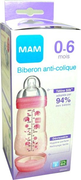 MAM développe depuis 35 ans des produits de puériculture uniques, tant par leur design que par leur fonctionnalité, afin de favoriser le développement des jeunes enfants et répondre aux exigences de leur parents. Chaque produit est conçu en partenariat avec des professionnels du monde médical, pédiatrique et scientifique : médecins, sages-femmes, psychologues du développement, designers et experts en technologie, afin que tous les bébés démarrent la vie du bon pied. Le biberon 1er âge MAM de 260 ml, en plastique incassable, qui offre une bonne prise en main, est ultra-fonctionnel avec ses larges ouvertures qui permettent un dosage facile du lait et un nettoyage efficace. Il peut être chauffé ou stérilisé au micro-onde (fonction auto-stérilisante). Sa tétine à débit lent est formulée à base de silicone doux comme la soie et extrêmement moelleux, sa forme légèrement aplatie rappelle instinctivement le sein, facilitant ainsi la prise de la tétine par Bébé. Ce biberon possède également une valve brevetée anti-colique qui permet de réguler l’ingestion d’air par bébé. Coliques diminuées dans 80 % des cas.