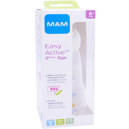 MAM développe depuis 35 ans des produits de puériculture uniques, tant par leur design que par leur fonctionnalité, afin de favoriser le développement des jeunes enfants et répondre aux exigences de leur parents. Chaque produit est conçu en partenariat avec des professionnels du monde médical, pédiatrique et scientifique : médecins, sages-femmes, psychologues du développement, designers et experts en technologie, afin que tous les bébés démarrent la vie du bon pied. Le biberon Easy Active 2ème âge MAM, en plastique incassable, qui offre une bonne prise en main, est ultra-fonctionnel avec ses larges ouvertures qui permettent un dosage facile du lait et un nettoyage efficace. Sa tétine à débit X ultra-rapide permet de laisser passer le liquide épais. Elle est formulée à base de silicone ultra-douce, avec une forme légèrement aplatie qui rappelle instinctivement le sein, facilitant ainsi la prise de la tétine par Bébé. Ce biberon possède également un capuchon anti-fuite et gradué très pratique pour garder la tétine toujours propre en déplacement, et doser de petites quantités.