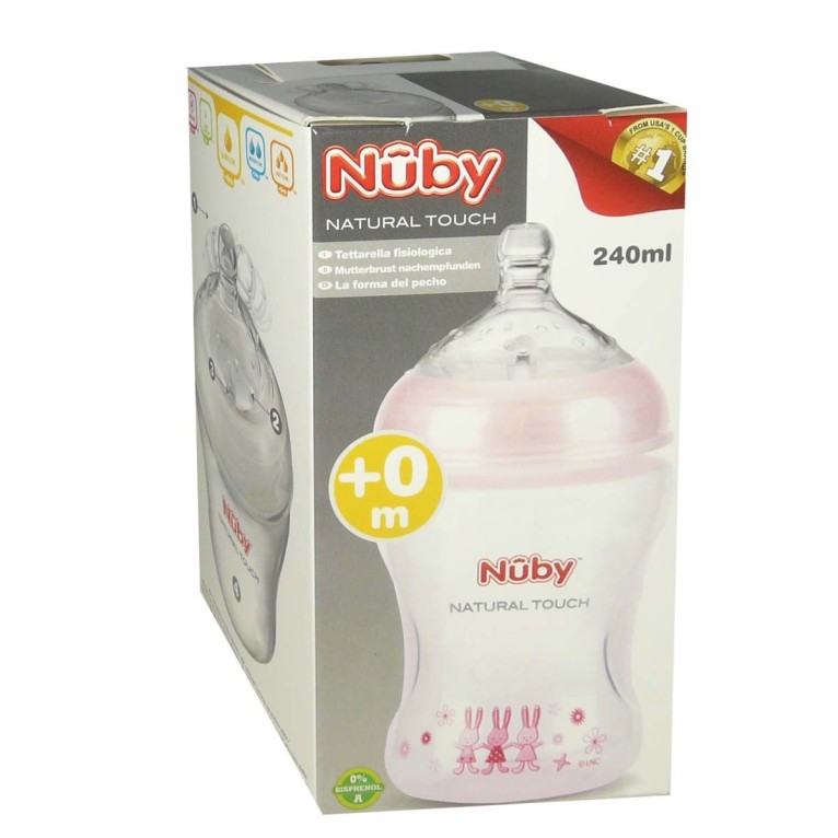 Les produits NUBY offrent aux bébés les meilleurs produits pour leur nutrition et leur confort et des produits aux mamans pour leur confort d'allaitement, de conservation et de stérilisation. Sa tétine à débit lent (0M+) extra-souple en silicone médical, très douce avec des ergots imite la forme du sein de la maman et ainsi procure au bébé une tétée confortable et rassurante. Elle est équipée de 3 valves Soft Air qui permet à l’air de rentrer à l’intérieur du biberon et pas dans l’estomac du bébé ce qui diminue les coliques et l'inconfort. Le biberon est doté d’un col large pour un nettoyage facile et de graduation pour faciliter le dosage du lait. Sa forme ergonomique permet à la maman et au bébé de bien tenir le biberon.