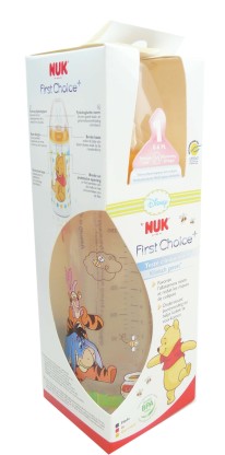 Le biberon First Choice 300 ml 0-6 mois de NUK, le meilleur dès les premières heures de la vie dans un biberon à l’effigie de Winnie l’ourson.