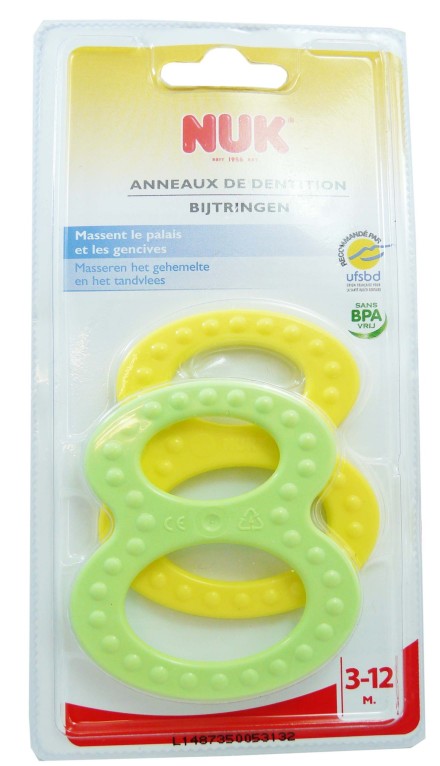 Les produits NUK offrent aux bébés les meilleurs produits pour leur nutrition et leur confort et des produits aux mamans pour leur confort d'allaitement, de conservation et de stérilisation. Les anneaux de dentition fabriqués en Allemagne, permettent grâce à leurs textures différentes de soulager les douleurs des poussées dentaires et de prévenir la formation des caries. Souples et à reliefs doux ils vont participer au développement des gencives qui débutent vers l’âge de 3 mois tout en permettant à bébé de bien le tenir avec ses petites mains par sa forme en 8. Ces 2 anneaux vont soulager par leurs picots en relief et découvrir des matières différentes. Très doux ils vont permettre d’augmenter la production de la salive ce qui va protéger de la formation des caries. Ces 2 anneaux plairont aux bébés per leur belle couleur pour leur découverte !