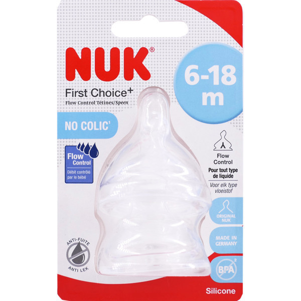 NUK élabore des produits de puériculture en sélectionnant de façon rigoureuse les matières premières, en assurant la traçabilité à toutes les étapes de fabrication, selon des procédures extrêmement strictes, afin d’offrir des produits fiables et de qualité aux parents, et donner aux bébés le meilleur dès les premières heures de la vie.La Tétine Flow Control No Colic physiologique Nuk en silicone a la même forme que le sein de la maman qui laisse de la place à la langue et à la mâchoire pour le plus grand confort de bébé lors du repas ressemblant à l’allaitement au sein. Son système Air System® limite les coliques, les régurgitations et l’aérophagie en faisant circuler l’air régulièrement dans le biberon. Encore plus souple que les autres tétines des biberons Nuk First, elles permettent par leur système « soft zone » de suivre le développement du palais des bébés pour une tétée naturelle. L’ouverture de la tétine en Y par sa technologie innovante Flow Control, permet à l’enfant de contrôler lui-même la vitesse de la boisson qu’elle soit fluide ou épaisse. Etanche, la tétine ne s’ouvre que lorsque bébé tête en fonction de la force de succion. Les tétines sont compatibles avec tous les biberons NUK FIRST CHOICE+.