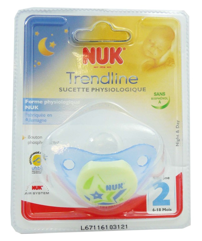 NUK élabore des produits de puériculture en sélectionnant de façon rigoureuse les matières premières, en assurant la traçabilité à toutes les étapes de fabrication, selon des procédures extrêmement strictes, afin d’offrir des produits fiables et de qualité aux parents, et donner aux bébés le meilleur dès les premières heures de la vie. Les sucettes NUK répondent de la meilleure façon au besoin naturel de succion des bébés : leur tétine physiologique en silicone respecte le développement des mâchoires de façon harmonieuse, dotées du système Air System®, ces sucettes permettent de laisser passer l'air et évitent tout risque d'irritation, leur anneau à picots facilite la prise en main de bébé et soulage les gencives douloureuses lors des poussées dentaires. Leur bouton phosphorescent très pratique, permet de retrouver la sucette même dans le noir.