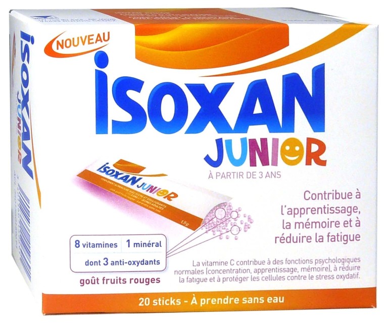 ISOXAN Junior, est un complément alimentaire à base des vitamines B6, C, B12 et du zinc, qui contribuent au fonctionnement normal du système immunitaire, et de vitamine B5, qui participe à des performances intellectuelles normales. Les vitamines B2 et B9 viennent s’ajouter à ce produit, et aident à réduire la fatigue.