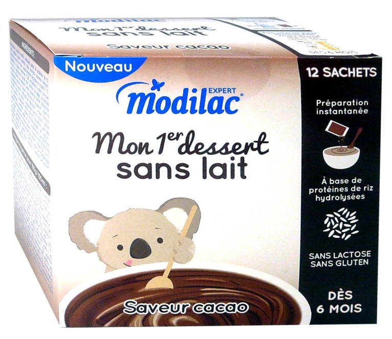 MODILAC est une marque de lait infantile crée en 1984 par le laboratoire SODILAC, spécialement conçue pour offrir un large choix de laits s’approchant au mieux du lait maternel, et répondre aux différents besoins nutritionnels des nourrissons pour accompagner leur croissance de façon harmonieuse. Mon 1er Dessert sans lait est un aliment diététique à des fins médicales qui diminue le risque d’allergie au lait de vache. Sa formule à base de protéines de riz hydrolysées ne contient pas de protéines de lait de vache ni de gluten et lactose pour une bonne digestion du dessert sans risque de réactions allergiques. Onctueux et à la saveur gourmande, ce dessert facile et rapide à préparer ravira les papilles des tout-petits !