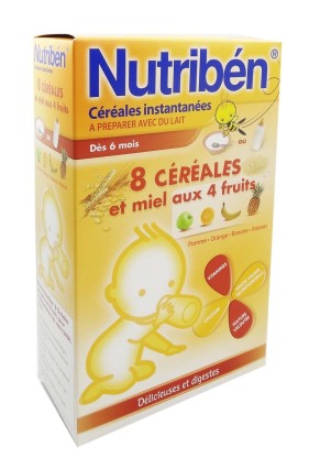 Née à Barcelone en 1963, la marque NUTRIBEN développe des produits spécialement conçus pour couvrir l’ensemble des besoins alimentaires du nourrisson : petits pots, farines et laits infantiles. Désormais implanté en France depuis 2006, NUTRIBEN œuvre au quotidien pour offrir des produits alimentaires sûrs, efficaces et rigoureusement contrôlés, qui accompagneront harmonieusement la croissance des bébés. NUTRIBEN propose sa gamme de céréales instantanées, conçues pour assurer une excellente assimilation, une très bonne digestibilité et répondre à tous les besoins nutritionnels des bébés. NUTRIBEN 8 céréales et miel aux 4 fruits, est une farine alimentaire enrichie en vitamines et minéraux pour compléter de façon équilibrée l’alimentation de bébé, tout en régulant son transit. Dès 6 mois.