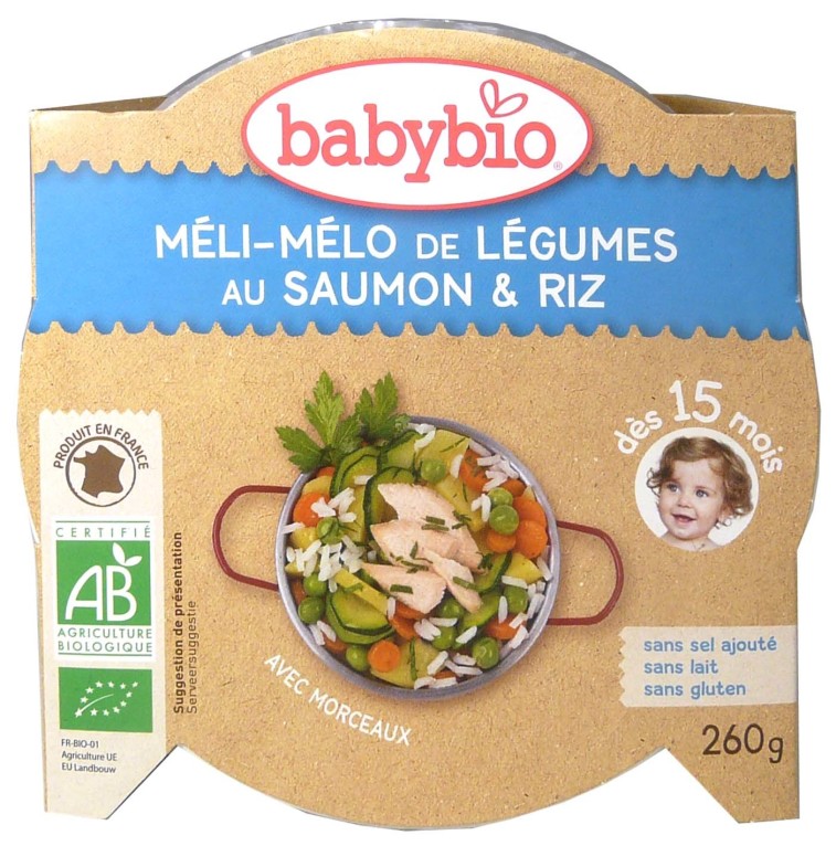 L’Assiette Méli-mélo légume Saumon riz de BABYBIO, un délicieux repas à donner aux tout-petits à partir de 15 mois pour apprendre à manger tout seul.