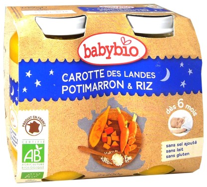 Les petits pots Bonne nuit pour bébé de BABYBIO sont de savoureux légumes et féculents 100% bio cuits à la vapeur pour les bébés dès 6 mois pour faire découvrir de nouvelles saveurs. Les petits pots bonne nuit sont idéals pour le repas du soir pour permettre aux bébés de passer une bonne nuit par un effet de satiété grâce aux féculents riches en sucres lents. Ce délicieux repas va faire découvrir aux bébés dès 6 mois les saveurs légèrement sucrées et parfumées des carottes des Landes, avec le goût de la châtaigne et du potimarron, et son riz. Ce Petit pot bonne nuit adapté ravira les papilles des bébés! Sans sel ajoutés, sans gluten, sans lait, sans épaississant.