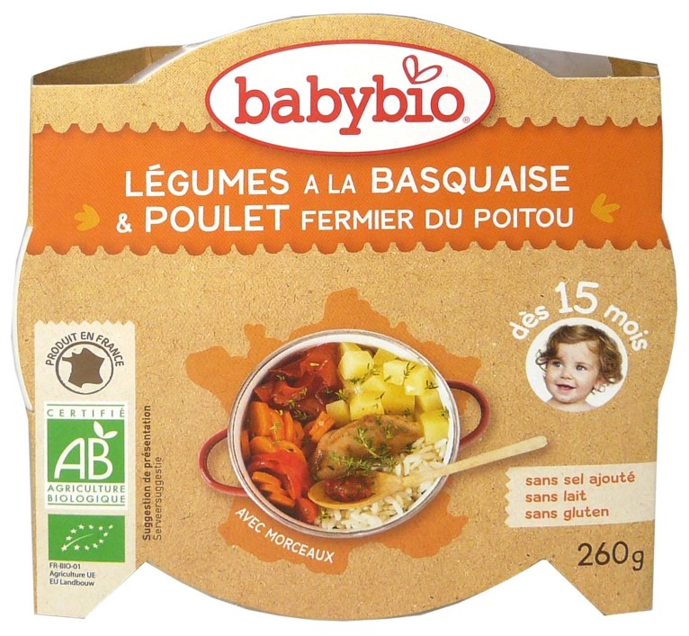 L’Assiette Légumes à la basquaise-Poulet de BABYBIO, un délicieux repas à donner aux tout-petits à partir de 15 mois pour apprendre à manger tout seul.