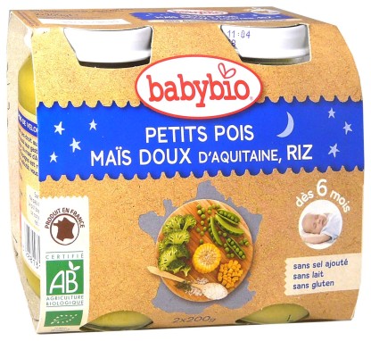 Les petits pots Bonne nuit pour bébé de BABYBIO sont de savoureux légumes et féculents 100% bio cuits à la vapeur pour les bébés dès 6 mois pour faire découvrir de nouvelles saveurs. Les petits pots bonne nuit sont idéals pour le repas du soir pour permettre aux bébés de passer une bonne nuit par un effet de satiété grâce aux féculents riches en sucres lents. Ce délicieux repas va faire découvrir aux bébés dès 6 mois les saveurs des petits pois d’Espagne, du maïs doux légèrement sucrés d’Aquitaine pour donner de la fraîcheur, et son riz avec une pointe de thym bio. Ce Petit pot bonne nuit velouté adapté ravira les papilles des bébés! Sans sel ajoutés, sans gluten, sans lait, sans épaississant.