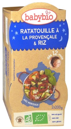 Les bols Bonne nuit pour bébé de BABYBIO sont de savoureux légumes et féculents avec morceaux 100% bio cuits à la vapeur pour les bébés dès 8 mois pour faire découvrir de nouvelles saveurs. Le Bol bonne nuit de ratatouille provençale et de riz est idéale pour le repas du soir pour permettre aux bébés de passer une bonne nuit. Ce délicieux repas va faire découvrir aux bébés dès 12 mois les saveurs du soleil des carottes des Landes, des poivrons d’Espagne et des courgettes de Provence avec ses aubergines et son riz. Ce Bol bonne nuit adapté ravira les papilles des bébés! Sans sel ajoutés, sans gluten, sans lait, sans épaississant.