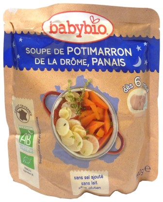 Les sachets Bonne nuit pour bébé de BABYBIO sont de savoureux légumes et féculents accompagnés de poissons ou de viandes 100% bio cuits à la vapeur pour les bébés dès 6 mois pour faire découvrir de nouvelles saveurs. Le Sachet bonne nuit de Soupe Potimarron de la Drôme et Panais est idéale pour le repas du soir pour permettre aux bébés de passer une bonne nuit. Le Sachet Bonne nuit va faire découvrir aux bébés dès 6 mois les saveurs du panais pour un petit goût sucré, et du potimarron de la Drôme pour appeler le goût de la châtaigne. Ce sachet bonne nuit adapté ravira les papilles des bébés! Sans sel ajoutés, sans gluten, sans lait, sans épaississant