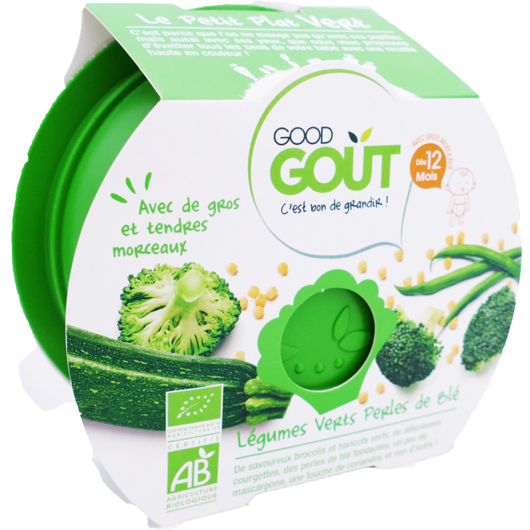 Découvrez la nouvelle marque française d’alimentation biologique sans produits chimiques ni pesticides ni OGM, à base de fruits et de légumes savoureux : GOOD GOUT. Spécialisée dans la conception de produits délicieux, GOOD GOUT vous assure qualité nutritionnelle, saveurs naturelles et plaisirs gustatifs pour régaler les enfants dès le plus jeune âge ! Lorsque vient l’âge de la diversité alimentaire, Bébé est avide de nouvelles saveurs et de textures différentes. Le Petit Plat Vert Légumes Verts Perles de Blé qui ne contiennent pas d’ingrédients nocifs pour les enfants, régaleront les papilles des plus jeunes ! Avec des gros morceaux tendres et fondants de légumes verts (brocolis, courgettes, haricots verts) et un soupçon de coriandre et mascarpone, ce petit plat gourmand haut en couleurs et textures 100% Bio plaira aux enfants ! Ingénieuse, l’assiette se chauffe au micro-ondes et son format permet de l’emporter partout et d’être prise facilement par bébé.