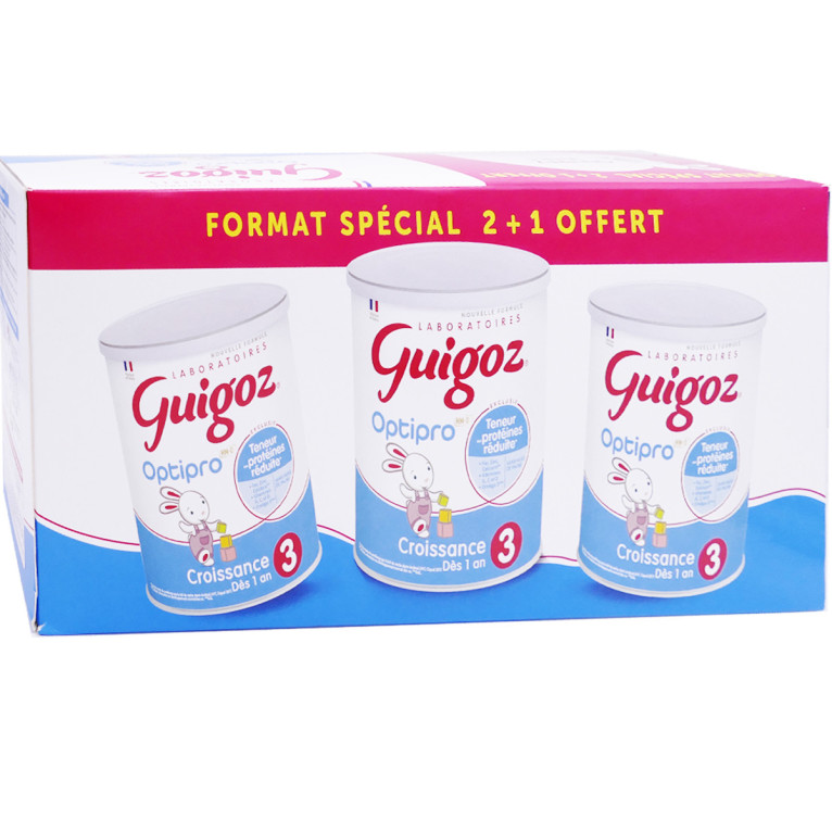 Depuis plus d’un siècle, Guigoz accompagne le développement harmonieux des bébés et la sérénité de leur maman en proposant des laits infantiles de qualité, conçus pour apporter une réponse adaptée à tous les besoins nutritionnels et/ou digestifs des tout-petits. Guigoz OPTIPRO Croissance 3 est un lait en poudre qui permet aux bébés de passer du lait maternel au biberon tout en douceur, et également de favoriser le bon développement du bébé en apportant tous les nutriments nécessaires par le procédé OPTIPRO : taux de protéines réduit (3,3 fois moins que le lait de vache), fer, vitamines, minéraux, acide alpha-linolénique (AAL) un acide gras de la famille des oméga 3. Avec ce lait, le système immunitaire sera renforcé, les bébés grandiront harmonieusement et accepteront les biberons facilement comme le sein de la maman. Le lait OPTIPRO Croissance au goût naturel sans sucres ajoutés permettra à bébé de prendre son biberon sans difficulté !