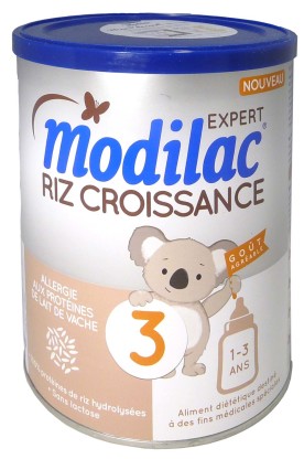 Le laboratoire MODILAC conçoit des produits nutritionnels pour les tout-petits (laits, céréales…) pour un développement harmonieux. Le lait Expert Riz 3 Croissance est un aliment diététique à des fins médicales qui diminue le risque d’allergie au lait de vache ainsi que les régurgitations. Sa formule à base de protéines de riz hydrolysées ne contient pas de protéines de lait de vache ni de lactose pour une bonne digestion du lait sans risque de réactions allergiques. Il contient une formule épaissie à la caroube et à l’amidon de maïs pour épaissir le bol alimentaire dans l’estomac afin de faciliter la digestion et limiter le risque de régurgitations. Le lait Expert Riz 3 Croissance participe également au bon développement de bébé en apportant tous les nutriments nécessaires pour une bonne croissance.
