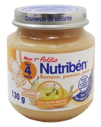 Née à Barcelone en 1963, la marque NUTRIBEN développe des produits spécialement conçus pour couvrir l’ensemble des besoins alimentaires du nourrisson : petits pots, farines et laits infantiles. Désormais implanté en France depuis 2006, NUTRIBEN œuvre au quotidien pour offrir des produits alimentaires sûrs, efficaces et rigoureusement contrôlés, qui accompagneront harmonieusement la croissance des bébés. Lorsque vient l’âge de la diversité alimentaire, Bébé est avide de nouvelles saveurs et de textures différentes. NUTRIBEN propose sa gamme de petits pots, élaborés exclusivement avec des produits naturels, sans OGM, sans pesticide, sans conservateur, sans colorant, sans gluten, sans œuf, sans lait ni Additif : les Potitos®. Mon premier Potito est destiné aux bébés dès 4 mois. Le Potito banane, pomme, poire est idéal pour initier bébé aux saveurs sucrées. Enrichi en vitamine C.