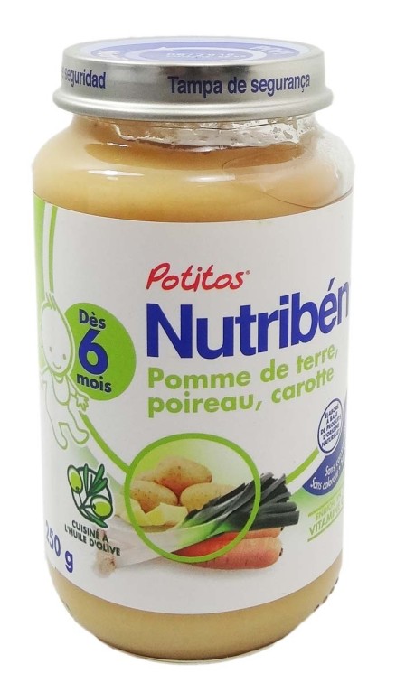 Née à Barcelone en 1963, la marque NUTRIBEN développe des produits spécialement conçus pour couvrir l’ensemble des besoins alimentaires du nourrisson : petits pots, farines et laits infantiles. Désormais implanté en France depuis 2006, NUTRIBEN œuvre au quotidien pour offrir des produits alimentaires sûrs, efficaces et rigoureusement contrôlés, qui accompagneront harmonieusement la croissance des bébés. Lorsque vient l’âge de la diversité alimentaire, Bébé est avide de nouvelles saveurs et de textures différentes. NUTRIBEN propose sa gamme de petits pots, élaborés exclusivement avec des produits naturels, sans OGM, sans pesticide, sans conservateur, sans colorant, sans gluten, sans œuf, sans lait ni Additif : les Potitos®. Les Potitos sont destinés aux bébés dès 6 mois. Le Potito pomme de terre, poireau, carotte sans protéine est idéal pour le repas du soir ou pour les périodes de troubles intestinaux chez bébé comme les diarrhées.