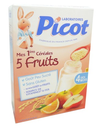 Depuis 1896, PICOT développe des produits de nutrition infantile de haute qualité et propose des gammes complètes de laits infantiles, céréales instantanées, jus de fruits… issus d’un savoir-faire de tradition, pour participer à la croissance harmonieuse des bébés et assurer la tranquillité des mamans. Les céréales PICOT sont élaborées à partir de recettes originales qui se transmettent de génération en génération, avec un procédé unique de fabrication et une composition sans sucre ajouté, sans gluten, sans conservateur ni colorant. Les céréales aux 5 fruits (orange, banane, pomme, abricot et poire) riches en vitamines et minéraux (fer, vitamines A, D, C, B1, B2, B12, PP, B9) initient Bébé à la découverte de nouvelles saveurs, tout en répondant parfaitement à ses besoins nutritionnels. Elles accompagnent de façon savoureuse le lait 2ème âge au moment de la diversification alimentaire.