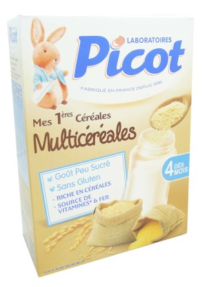 Depuis 1896, PICOT développe des produits de nutrition infantile de haute qualité et propose des gammes complètes de laits infantiles, céréales instantanées, jus de fruits… issus d’un savoir-faire de tradition, pour participer à la croissance harmonieuse des bébés et assurer la tranquillité des mamans. Les céréales PICOT sont élaborées à partir de recettes originales qui se transmettent de génération en génération, avec un procédé unique de fabrication et une composition sans sucre ajouté, sans gluten, sans conservateur ni colorant. Les Multicéréales riches en vitamines et minéraux (fer, vitamines A, D, C, B1, B2, B12, PP, B9) initient Bébé à la découverte de nouvelles saveurs, tout en répondant parfaitement à ses besoins nutritionnels. Elles accompagnent de façon savoureuse le lait 2ème âge au moment de la diversification alimentaire.