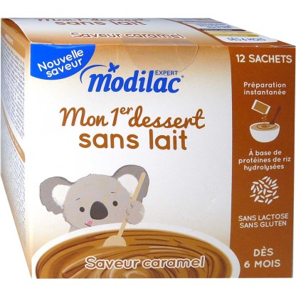 MODILAC est une marque de lait infantile crée en 1984 par le laboratoire SODILAC, spécialement conçue pour offrir un large choix de laits s’approchant au mieux du lait maternel, et répondre aux différents besoins nutritionnels des nourrissons pour accompagner leur croissance de façon harmonieuse. Mon 1er Dessert sans lait est un aliment diététique à des fins médicales qui diminue le risque d’allergie au lait de vache. Sa formule à base de protéines de riz hydrolysées ne contient pas de protéines de lait de vache ni de gluten et lactose pour une bonne digestion du dessert sans risque de réactions allergiques. Onctueux et à la saveur gourmande, ce dessert facile et rapide à préparer ravira les papilles des tout-petits !