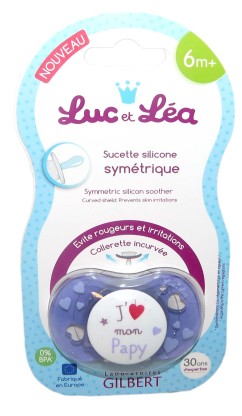 La sucette Luc et Léa « J'aime mon papy » apaise et rassure les bébés à partir de 6 mois tout en respectant le développement de la bouche.
