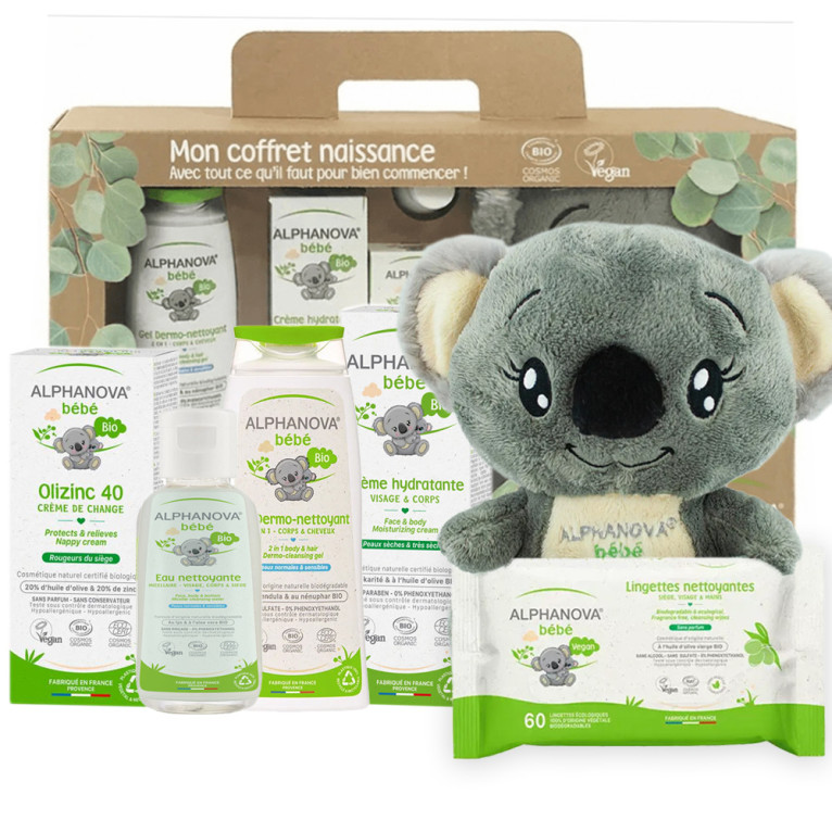 Ce coffret contient 6 produits essentiels pour prendre soin de bébé au quotidien. Un dermo-nettoyant 200ml pour le bain de bébé. Une crème hydratante 75ml pour prendre soin de sa peau. Une crème de change Olizinc 40 50g pour les rougeurs du siège. Un paquet de lingettes sans parfum à l’huile d’olive BIO 60 unités. Une eau nettoyante pour la toilette de bébé 50ml. Une peluche koala de 20cm. Grâce à Leur composition bio et naturelle, ce coffret est idéal pour les peaux sensibles des nourrissons.