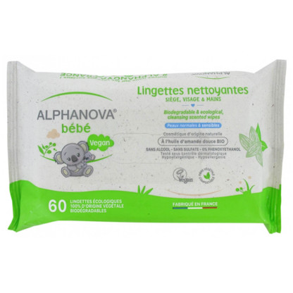 Les lingettes Nettoyantes d'ALPHANOVA dans votre parapharmacie en ligne à prix discount, nettoient en douceur et respectent la peau fragile du corps visage et fesses des tout-petits et des enfants.