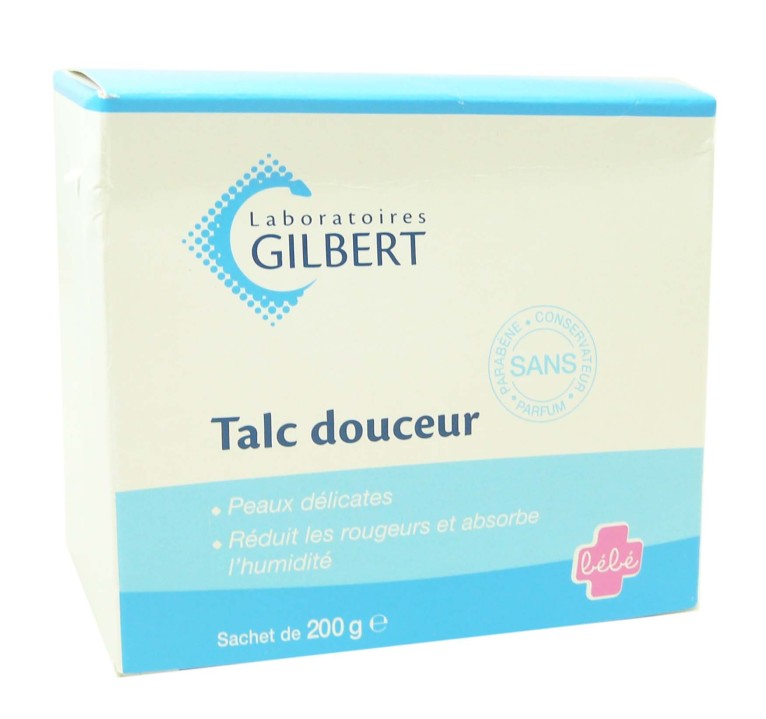 Depuis plus d’un siècle, Les laboratoires GILBERT développent un large choix de produits destiné à la santé et au bien-être de la famille, avec un souci constant d’innovation, de qualité, d’efficacité et de sécurité au meilleur prix pour tous. Le talc douceur de GILBERT, soin incontournable de l’hygiène des bébés, est spécialement formulé pour absorber en douceur les excès d’humidité, apaiser les irritations et prévenir les rougeurs causées par les frottements. Sachet de 200g destiné à rechargé la poudreuse. Sans paraben, sans conservateur, sans parfum, sans colorant.