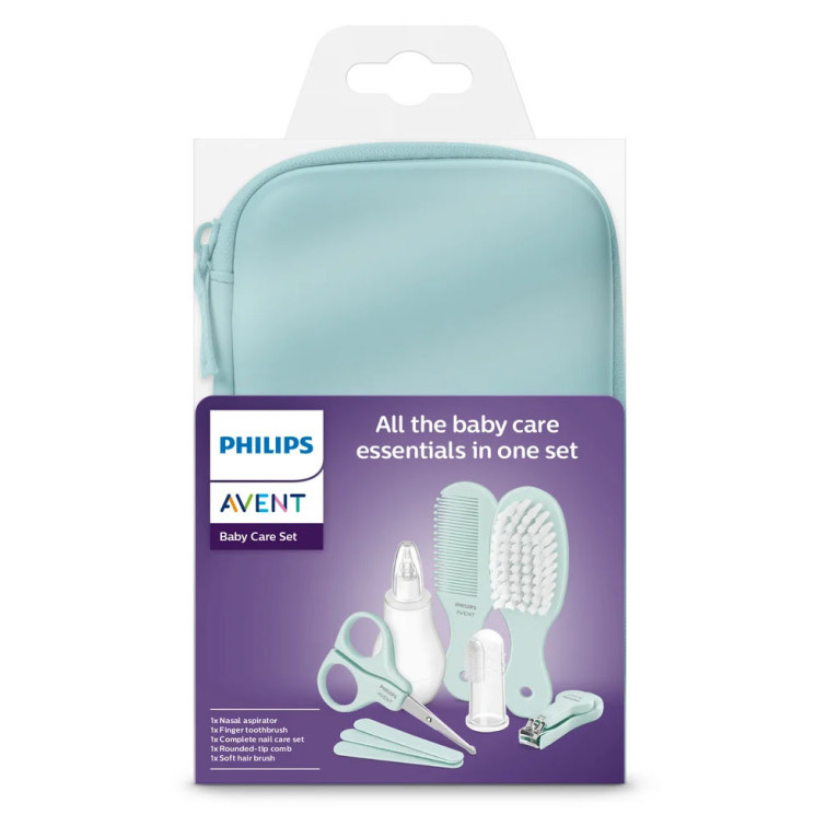 Thermomètre digital (SCH420) à piles ; Mouche-bébé manuel à embout souple ;Kit de manucure complet avec ciseaux à bouts ronds, coupe-ongles et 3 limes ;Kit spécial cheveux avec peigne aux dents arrondies et une brosse à cheveux douce ; Doigt de massage