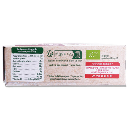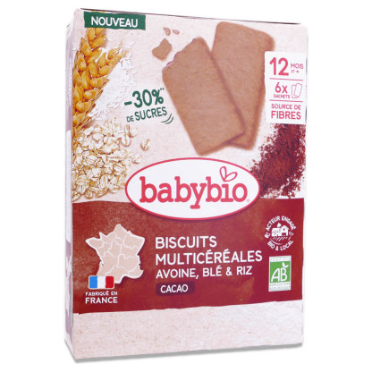 Biscuit multicéréales au cacao bio adapté aux enfants en bas âge.