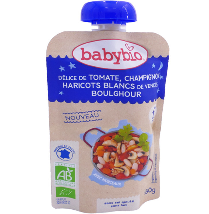 Le laboratoire Babybio, est une entreprise spécialiste de l’alimentation infantile et propose une large gamme de produits de qualité exclusivement bio destinés à l’alimentation des enfants dès leur plus jeune âge, conçus et fabriqués exclusivement en France, afin de participer activement à l’économie locale tout en favorisant le maintien des emplois régionaux. Babybio Délice de Tomate Champignon Haricots Blanc est un plat composé d’ingrédients issus de l'agriculture biologique, sans lait, sans sel ajoutés et sans OGM. Une gourde gourmande qui ravira les papilles des bébés, composée d’une mixture de tomate, haricots blancs, champignon et de boulgour...Un vrai régal qui peut se consommer à température ambiante ou légèrement tiédie.