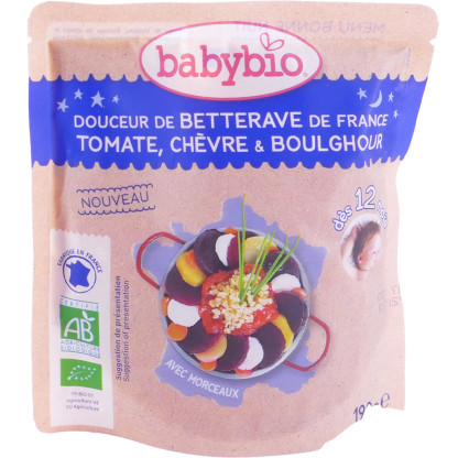 Les sachets Bonne nuit pour bébé de BABYBIO sont de savoureux légumes et féculents accompagnés de poissons ou de viandes 100% bio cuits à la vapeur pour les bébés dès 6 mois pour faire découvrir de nouvelles saveurs. Ce Sachet bonne nuit est idéal pour le repas du soir pour permettre aux bébés de passer une bonne nuit. Le Sachet Bonne nuit va faire découvrir aux bébés dès 12 mois les saveurs de la betterave, la tomate, le chèvre et le boulghour. Ce sachet bonne nuit adapté ravira les papilles des bébés! Sans sel ajoutés, sans gluten, sans lait, sans épaississant