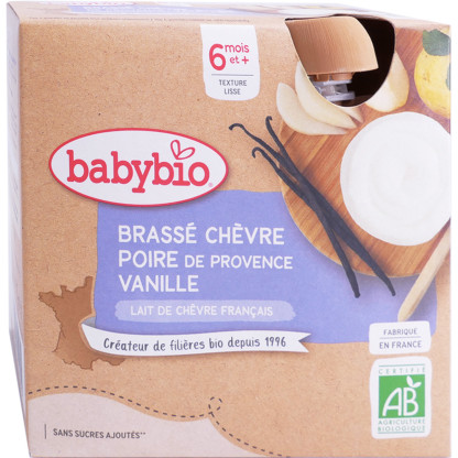 Les Gourdes de desserts lactés Brassé Chèvre Poire Vanille de BABYBIO discount, un bon dessert au lait de chèvre français, à donner aux tout-petits à partir de 6 mois dans votre parapharmacie à prix discount, pour commencer à diversifier leur alimentation tout en douceur et en gourmandise ! Saveur Poire Vanille