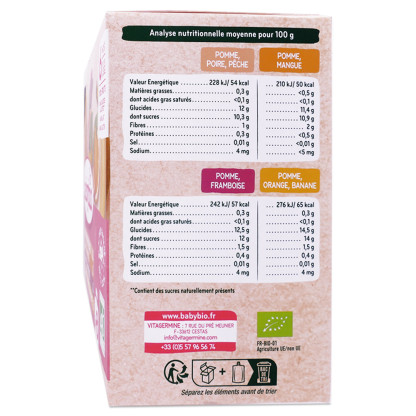 Pomme Framboise : Pommes de France* 85%, framboises d'Espagne* 15%. Pomme Orange Banane : Pommes de France* 71,8%, jus d'orange d'Espagne* 14%, bananes d'Equateur* 14%, jus concentré de citron d'Espagne* 0,2%.*Ingrédients issus de l'agriculture biologique
