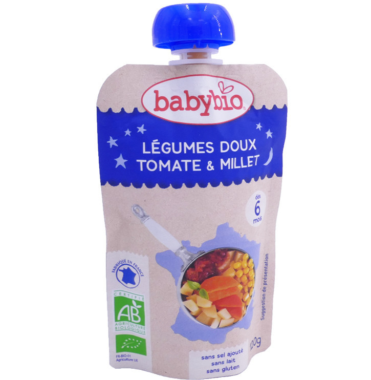 Le laboratoire Babybio, est une entreprise spécialiste de l’alimentation infantile et propose une large gamme de produits de qualité exclusivement bio destinés à l’alimentation des enfants dès leur plus jeune âge, conçus et fabriqués exclusivement en France, afin de participer activement à l’économie locale tout en favorisant le maintien des emplois régionaux. Légumes Doux Tomate & Millet est un plat composé d’ingrédients issus de l'agriculture biologique, sans lait, sans sel ajoutés et sans Gluten. Une gourde gourmande qui ravira les papilles des bébés, composée d’une mixture de tomate, de maïs doux d’Aquitaine, de pomme de terre du Val de Loire et de patates douces...Un vrai régal pour la nuit qui peut se consommer à température ambiante ou légèrement tiédie.