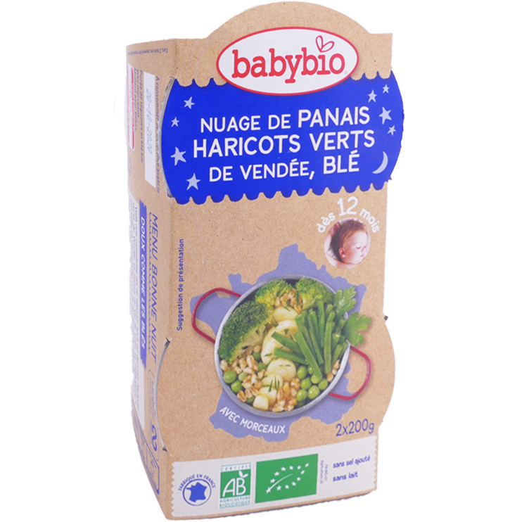 Le laboratoire Babybio, est une entreprise spécialiste de l’alimentation infantile et propose une large gamme de produits de qualité exclusivement bio destinés à l’alimentation des enfants dès leur plus jeune âge, conçus et fabriqués exclusivement en France, afin de participer activement à l’économie locale tout en favorisant le maintien des emplois régionaux. Nuage de Panais Haricots Verts Blé est un plat composé d’ingrédients issus de l'agriculture biologique, sans lait, sans sel ajoutés. Une cassolette gourmande qui ravira les papilles des bébés, composée d’haricots vert de Vendée et de Panais mélangé au blé...Un vrai régal pour la nuit pour mettre bébé en appétit.