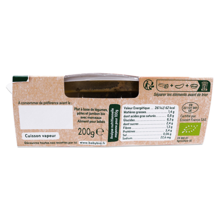 Plat à base de légumes, pâtes et jambon bio avec morceaux - Aliment pour bébés