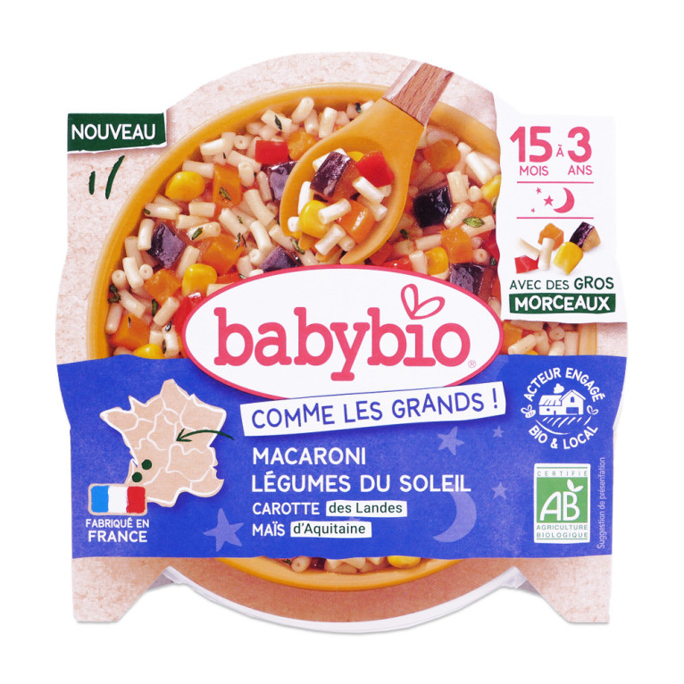 Ce plat préparé de la marque BABYBIO est élaboré à partir d'ingrédients soigneusement sélectionnés pour les jeunes enfants dès 15 mois. Il contient des macaronis avec des gros morceaux de légumes du soleil tels que des tomates, des carottes, du maïs et des courgettes, qui participent à la bonne alimentation des tout-petits.