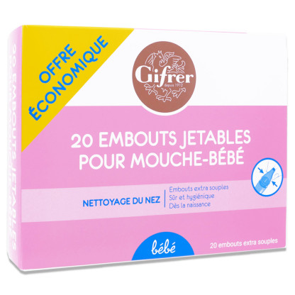 Placer l’embout dans le mouche-bébé et suivez les instructions mentionnées sur la boite du mouche-bébé. Chaque embout comprend un filtre absorbant qui retient le mucus. Cela rend le processus hygiénique. L’embout doit être jeté après chaque utilisation pour éviter toute infection ultérieure. Le mouche-bébé Gifrer est compatible uniquement avec les embouts extra-souples Gifrer